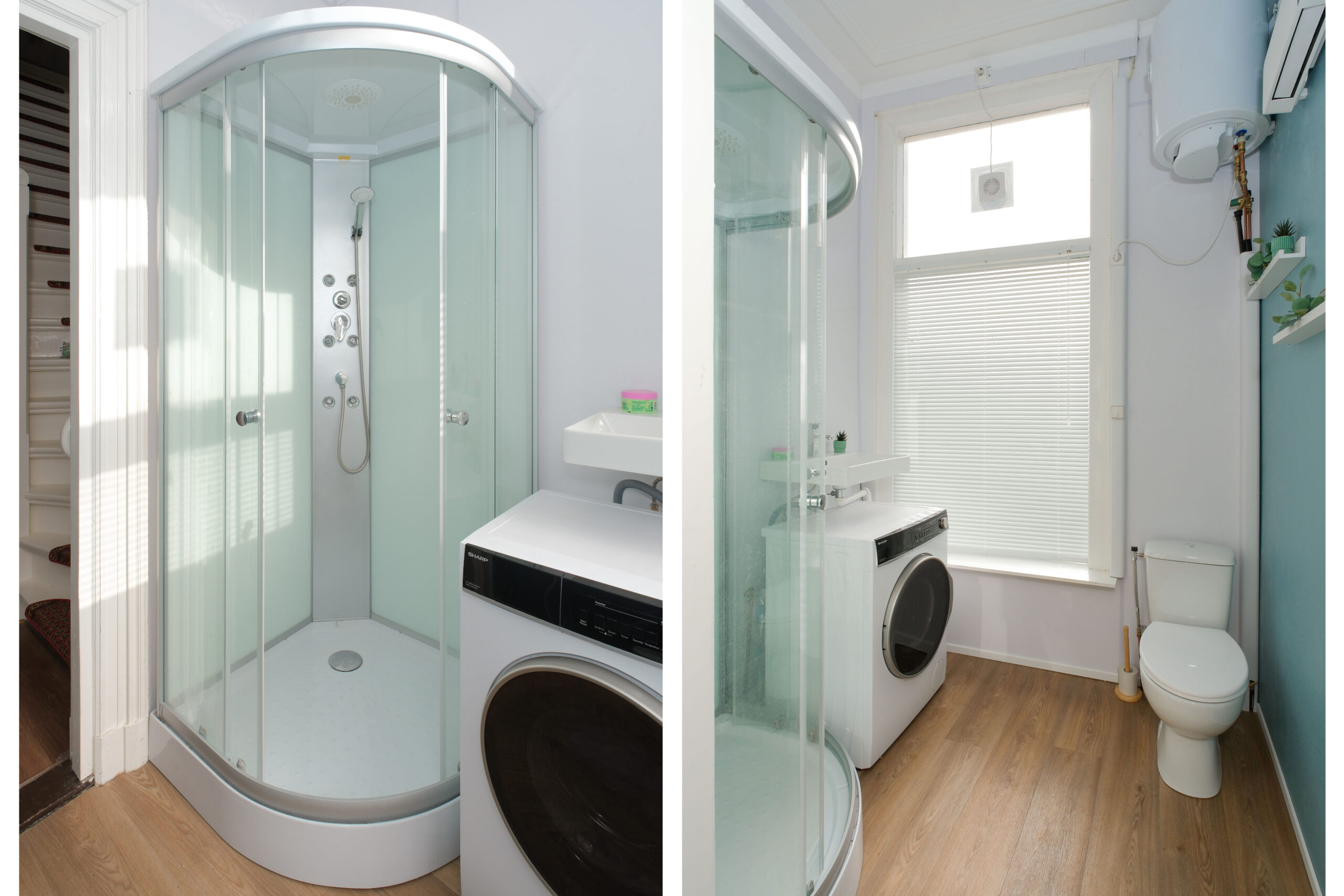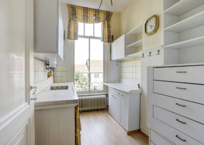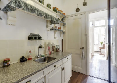 Eerste verdieping: overloop, ruime woonkamer met aan achterzijde toegang tot een balkon, tweede keuken, badkamer voorzien van douche, toilet en wasmachine aansluiting. Het is mogelijk de woonkamer en keuken om te bouwen tot twee of drie slaapkamers.