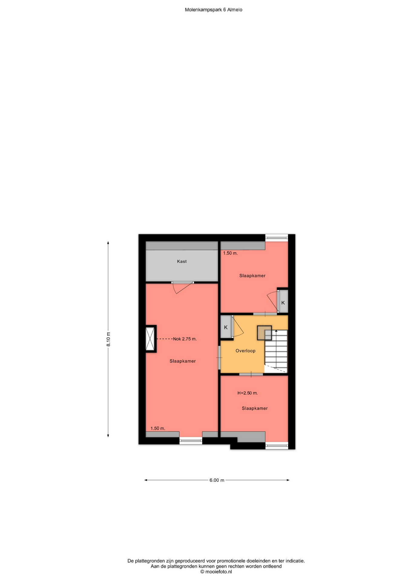 Tweede verdieping: overloop, twee slaapkamers beide voorzien van dakkapel.