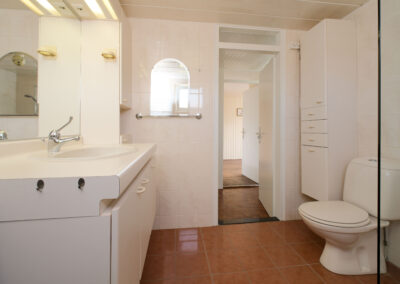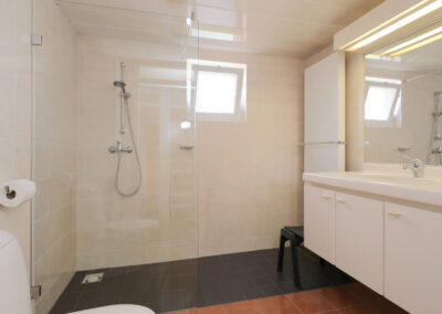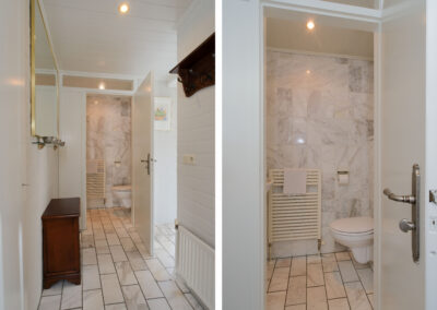 Eerste verdieping: overloop, twee slaapkamers waarvan de grote slaapkamer is voorzien van vaste kast, van oorsprong waren dit twee slaapkamers en kan indien mogelijk weer gesplitst worden in twee slaapkamers, badkamer voorzien van inloopdouche, toilet, designradiator en wastafelmeubel.